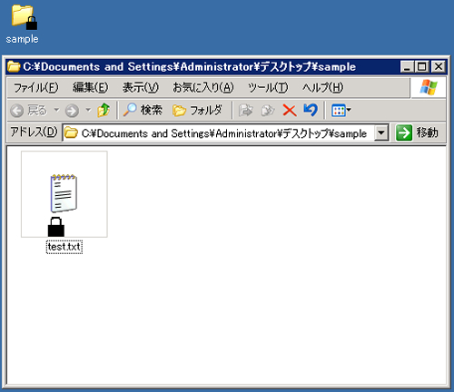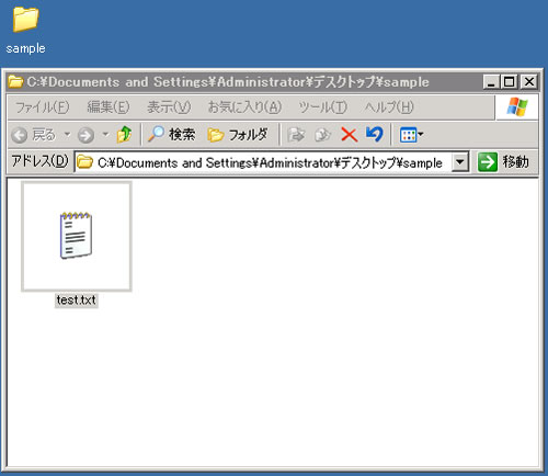 (『sample』フォルダ内には、『test.txt』ファイルが保存されています。)