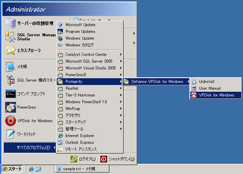 『スタート』 → 『すべてのプログラム(P)』 → 『Protegrity』 → 『Defiance VPDisk for Windows』 → 『VPDisk for Windows』を起動します。