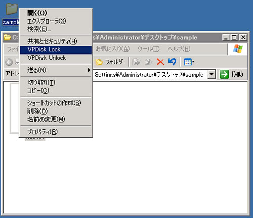 対象となるフォルダを右クリックし、コンテクストメニュー内の『VPDisk Lock』を選択します。