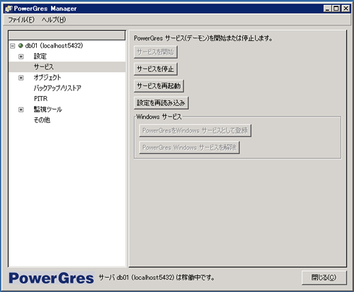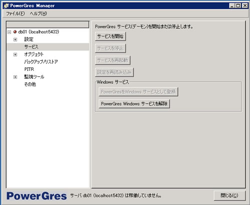 正常にPowerGresサービスが停止すると、画面右メニュー内『サービスを停止』ボタンがグレーアウトし、『サービスを開始』ボタンがアクティブになります。