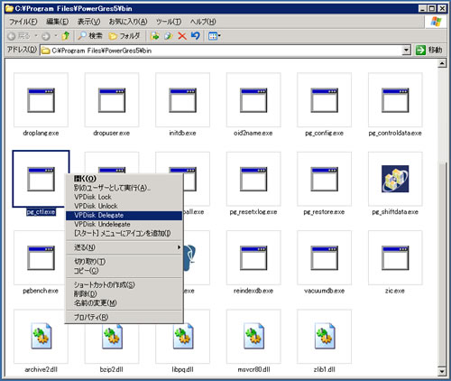 2.『C:\Program Files\PowerGres5\bin』ディレクトリ内にある、『pg_ctl.exe』を右クリックしコンテクストメニューを表示し、『VPDisk Delegate』を選択します。