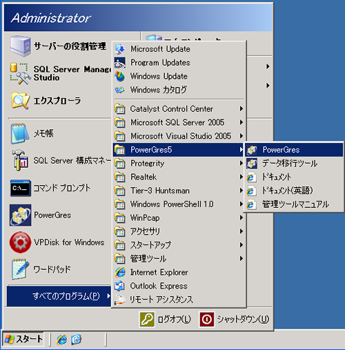 『スタート』 → 『すべてのプログラム(P)』 → 『PowerGres5』 → 『PowerGres』を起動します。